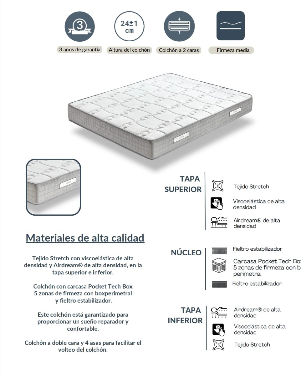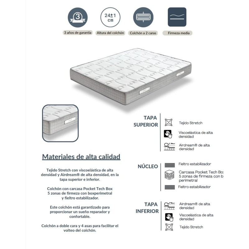 Colchon 105X190 Verso 22Cm Altura Con Airdream + Viscoelastica + Pocket Tech Box
