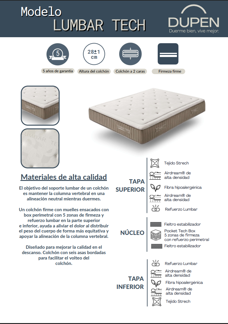 Colchon 150X200 Lumbar Tech Con Refuerzo Lumbar+Fieltro Estabilizador+ Pocket Tech Box.